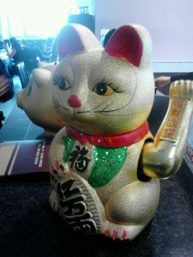 Quel gatto dorato agita il braccio e credo che se continuassi a guardarlo mentre saluta, vomiterei per terra.