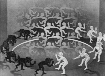Vi dirò, a me questi incontri strani, tra persone opposte ma che in quel dato attimo nella storia del mondo si incrociano e si legano per un istante tra differenze e cose in comune, come nel quadro di Escher…mi intrigano, non posso fare a meno di chiedermi chi sia e che cosa faccia quest’uomo, perché vada in giro vestito da spia sovietica e soprattutto…a che servano i cesti. La stessa curiosità di quando vedo le finestre illuminate di case sconosciute o uomini e donne al telefono, quando non senti cosa dicono ed hai disposizione solo i loro gesti per inventarti una storia su di loro.