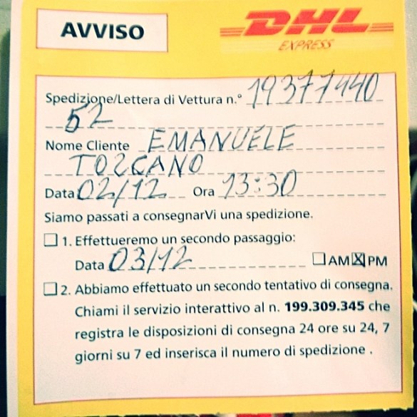Timbro alle 16:13 ed esco, non saluto nessuno. Torno a casa, guardo dentro la cassetta delle lettere. C’è un fogliettino giallo e rosso, con il mio nome sopra anche se la ‘S’ è scritta al contrario. Mi informa che il tizio nero aveva davvero un pacco per me…che forse passeranno domani, che se ci pensavo un attimo in più a tutta la situazione non ci sarebbe stato bisogno di sprecare un quadratino di cellulosa adesiva.