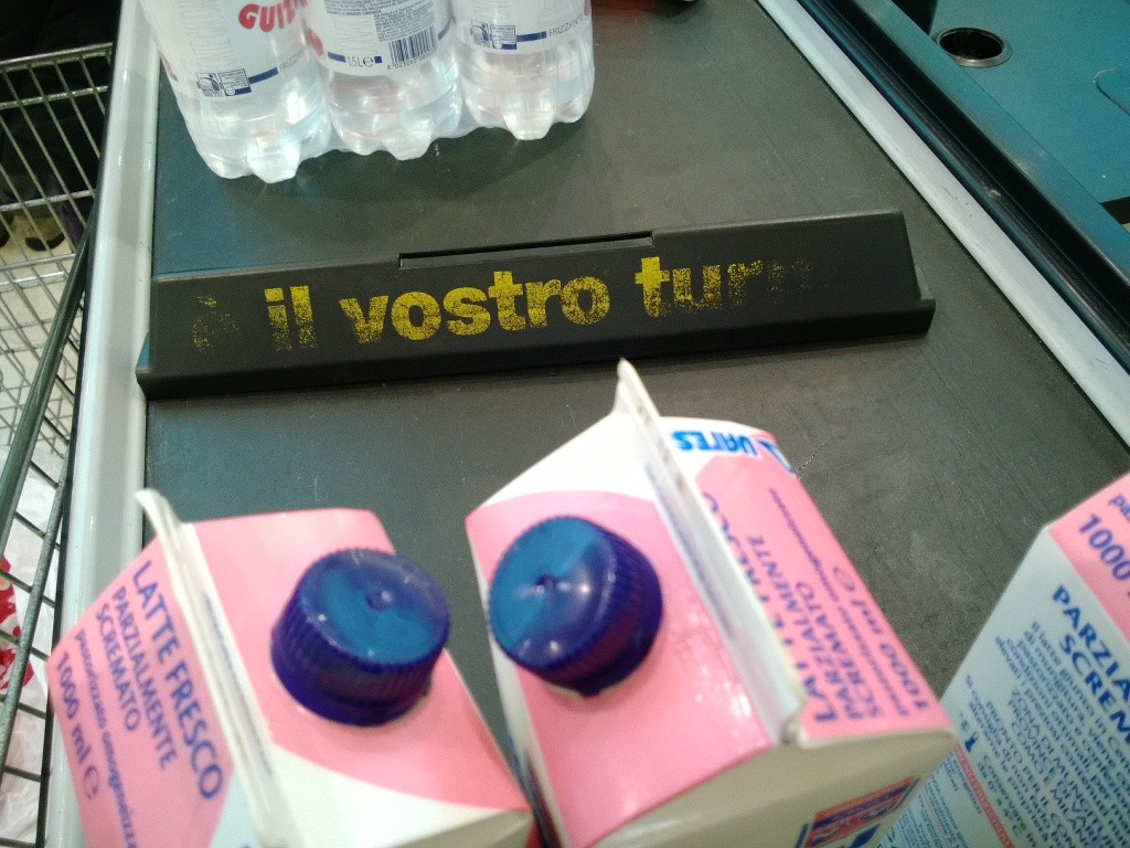 Pare decidano cosi, mi salutano e li saluto, mi metto in fila alla cassa…davanti ho una vecchia incappottata di beige e capelli biondo sporco, occhiali del tipo un po’ snob…sottili e appuntiti con cordicella…e mi guarda, girata verso di me anche se la sua spesa sul nastro va dalla parte opposta, sembra che attenda qualcosa ecco…poi, prende quel triangolo di plastica che sta sul bordo e lo mette tra me e lei, tira su un muro nero con su scritto ‘il vostro turno’ e mi sta sul cazzo perché accidenti, ho lasciato due metri dal tuo ultimo articolo…pensi davvero che te li possa far pagare…che non me ne accorga…o che qualcuno si sbagli…io, te o la cassiera…uno di noi capirà cosa è tuo e cosa è mio credo, non potrebbe mai succedere nulla e si, tu lo pensavi, ammettilo stronza che mi guardavi e aspettavi che lo facessi io, che mettessi quel triangolo ma no, io ho messo lo spazio, mi fido di tutti qua dentro che è quasi Natale e se mi chiedessi dei soldi io te li presterei pure sai? Ma non te…no…te costruisci barriere invece di essere più buona, vecchia del cazzo.